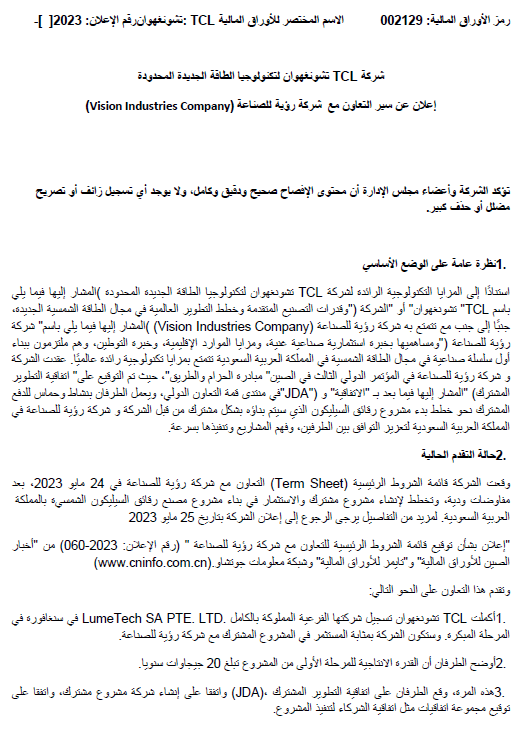 وذكرت (TCL) أنها وقعت مع شركة رؤية للصناعة في 24 مايو 2023، بعد مفاوضات ودية، وتخطط لإنشاء مشروع مشترك واستثمار في بناء مصنع رقائق السيليكون الشمسية في السعودية.