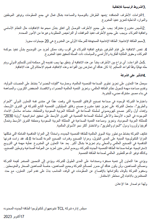 سولارابيك – الرياض، السعودية – 18 أكتوبر 2023: أعلنت شركة (TCL) تشونغهوان لتكنولوجيا الطاقة الجديدة المحدودة، عن سير تعاون مع شركة رؤية للصناعة (vision industries company).