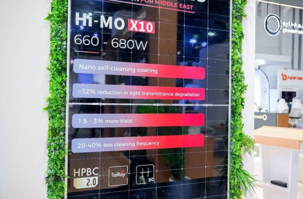 كما يدعم لوح “Hi-MO X10 Anti-Dust Pro” ممارسات تشغيلية أكثر استدامة عبر تقليل كميات المياه المستهلكة اللازمة لتنظيف الألواح، مما يتماشى مع أهداف الاستدامة البيئية في المناطق التي تعاني من ندرة المياه.
