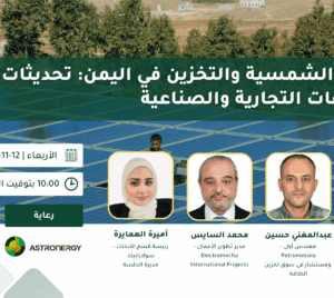 انضموا إلينا في ندوتنا القادمة بعنوان “الطاقة الشمسية والتخزين في اليمن” برعاية Astronergy، حيث نسلّط الضوء على أحدث تطورات سوق الطاقة المتجددة في اليمن ودور أنظمة التخزين في دعم الاستدامة والطاقة الموثوقة.ستجمع هذه الندوة خبراء القطاع لمناقشة الفرص، التحديات، وأفضل الممارسات في تبني حلول الطاقة الشمسية والتخزين على نطاق المؤسسات التجارية والصناعية. محاور الندوة: المتحدثون: