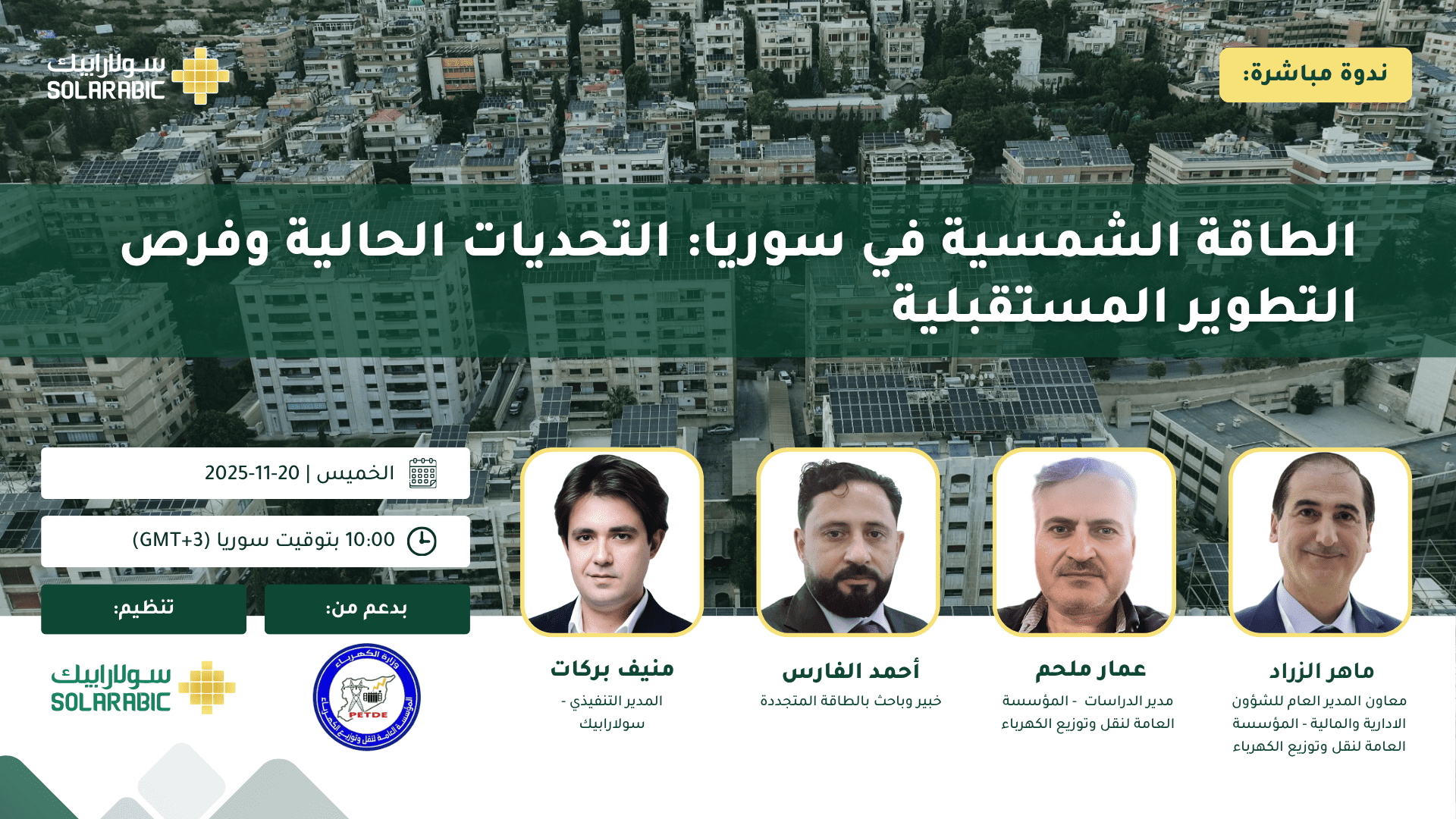 انضموا إلينا في ندوتنا القادمة بعنوان “الطاقة الشمسية في سوريا: التحديات الحالية وفرص التطوير المستقبلية” بدعم من المؤسسة العامة لنقل وتوزيع الكهرباء، والتي تسلّط الضوء على واقع سوق الطاقة الشمسية في سوريا ودورها في دعم إعادة الإعمار وتلبية احتياجات الطاقة المتزايدة. تتناول الندوة آخر المستجدات التنظيمية والفنية، وتناقش أبرز التحديات والفرص في مجالات الطاقة الشمسية والتخزين، بمشاركة نخبة من أبرز الخبراء والمتحدثين في قطاع الطاقة.