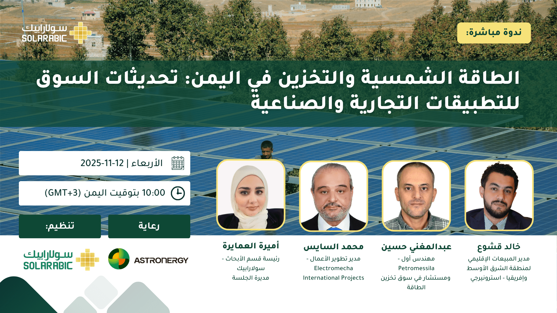 انضموا إلينا في ندوتنا القادمة بعنوان “الطاقة الشمسية والتخزين في اليمن” برعاية Astronergy، حيث نسلّط الضوء على أحدث تطورات سوق الطاقة المتجددة في اليمن ودور أنظمة التخزين في دعم الاستدامة والطاقة الموثوقة.