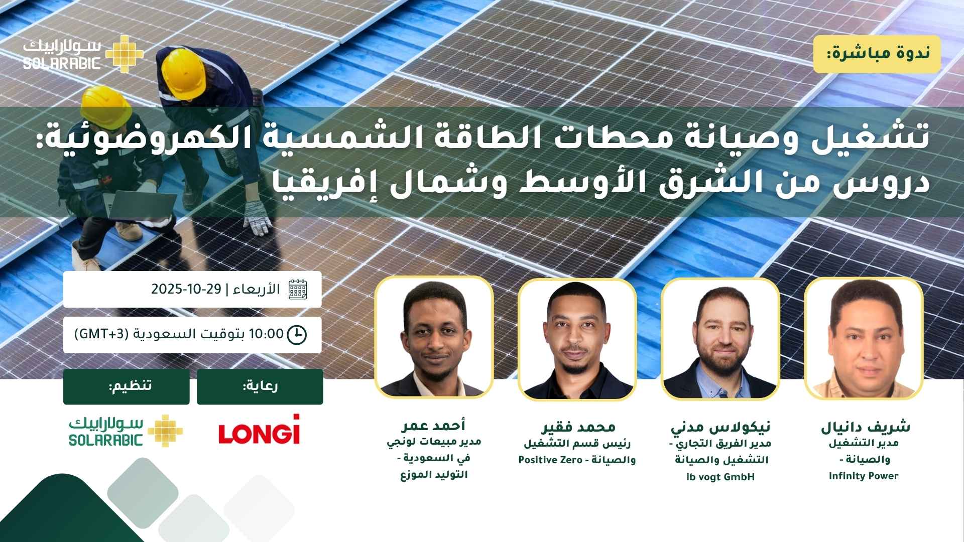 يسرّنا دعوتك لحضور جلسة خاصة أونلاين بعنوان “تشغيل وصيانة محطات الطاقة الشمسية الكهروضوئية: دروس من الشرق الأوسط وشمال إفريقيا” برعاية لونجي.