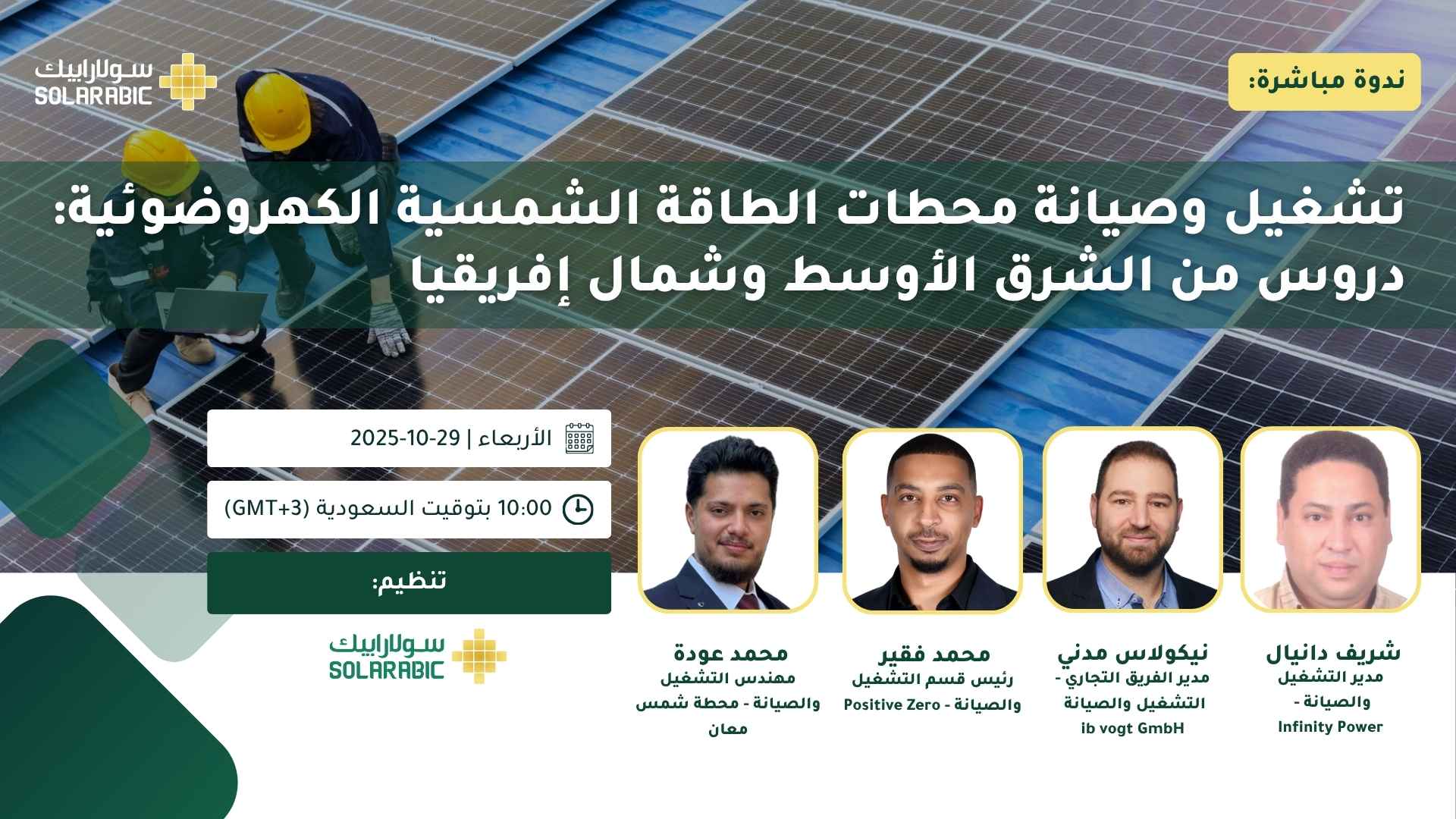 مع التوسع الكبير في مشاريع الطاقة الشمسية الكهروضوئية في منطقة الشرق الأوسط وشمال إفريقيا، أصبح ضمان الأداء الأمثل للمحطات وصيانتها المستمرة أمرًا بالغ الأهمية. في هذه الندوة، سنناقش أبرز التحديات التي تواجه مشغلي محطات الطاقة الشمسية في المنطقة، والحلول المبتكرة التي تساعد في تحسين الأداء، إطالة عمر المعدات، وتقليل تكاليف التشغيل.