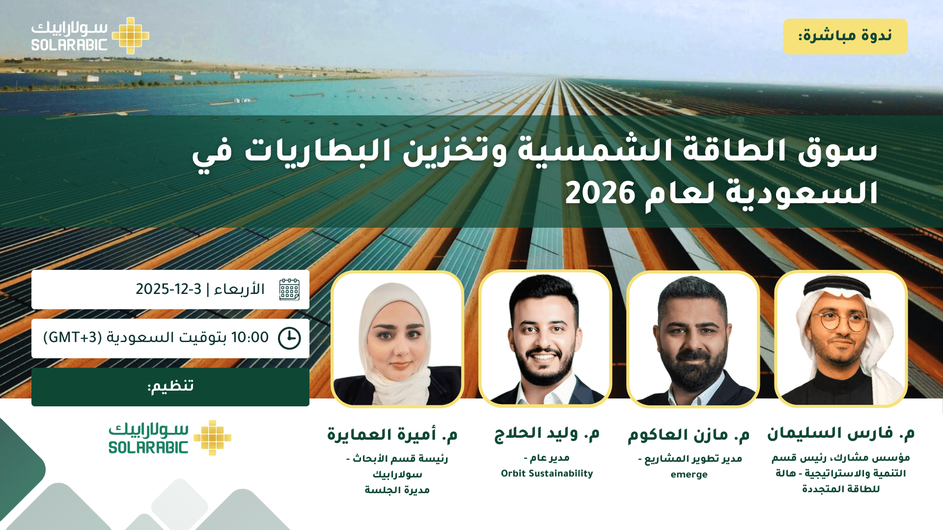انضموا إلينا في ندوتنا القادمة بعنوان “سوق الطاقة الشمسية وتخزين البطاريات في السعودية لعام ٢٠٢٦”، والتي تسلّط الضوء على أحدث تطورات السوق، أبرز مشاريع الطاقة الشمسية والتخزين، وفرص النمو المتوقعة خلال السنوات القادمة. تتناول الندوة أداء السوق خلال عام ٢٠٢٥، ومتطلبات المحتوى المحلي، إلى جانب قصص النجاح في مشاريع تخزين الطاقة على مستوى الجيجاواط، والنمو المتزايد لتطبيقات الطاقة الشمسية والتخزين في القطاع الزراعي.