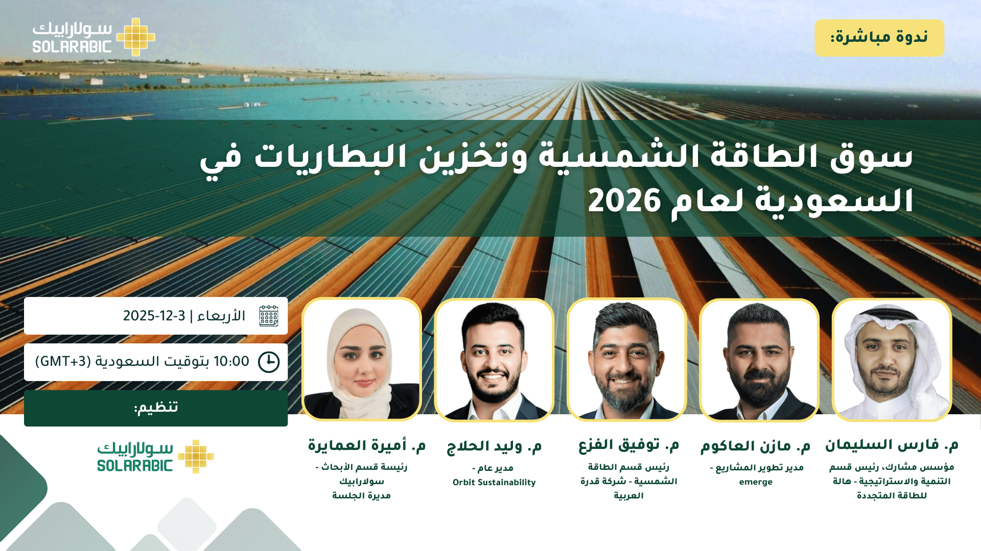 انضموا إلينا في ندوتنا القادمة بعنوان “سوق الطاقة الشمسية وتخزين البطاريات في السعودية لعام ٢٠٢٦”، والتي تسلّط الضوء على أحدث تطورات السوق، أبرز مشاريع الطاقة الشمسية والتخزين، وفرص النمو المتوقعة خلال السنوات القادمة. تتناول الندوة أداء السوق خلال عام ٢٠٢٥، ومتطلبات المحتوى المحلي، إلى جانب قصص النجاح في مشاريع تخزين الطاقة على مستوى الجيجاواط، والنمو المتزايد لتطبيقات الطاقة الشمسية والتخزين في القطاع الزراعي.