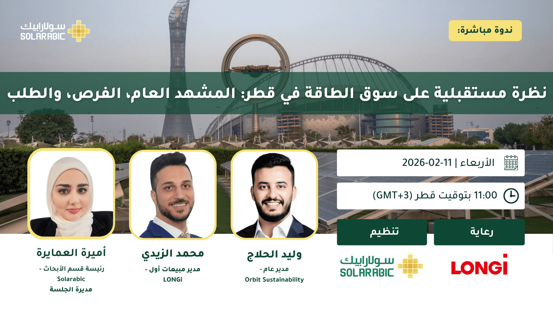 انضموا إلينا في ندوتنا القادمة بعنوان “نظرة مستقبلية على سوق الطاقة في قطر: المشهد العام، الفرص، والطلب”،حيث نستعرض ملامح سوق الطاقة في قطر، مع تسليط الضوء على تطور مزيج الطاقة، واتجاهات نمو الطلب، والسياسات التنظيمية، والأولويات الوطنية لقطاع الطاقة، إضافة إلى الفرص الاستثمارية والتجارية المتاحة، ومستوى جاهزية السوق لاعتماد التقنيات الحديثة.
