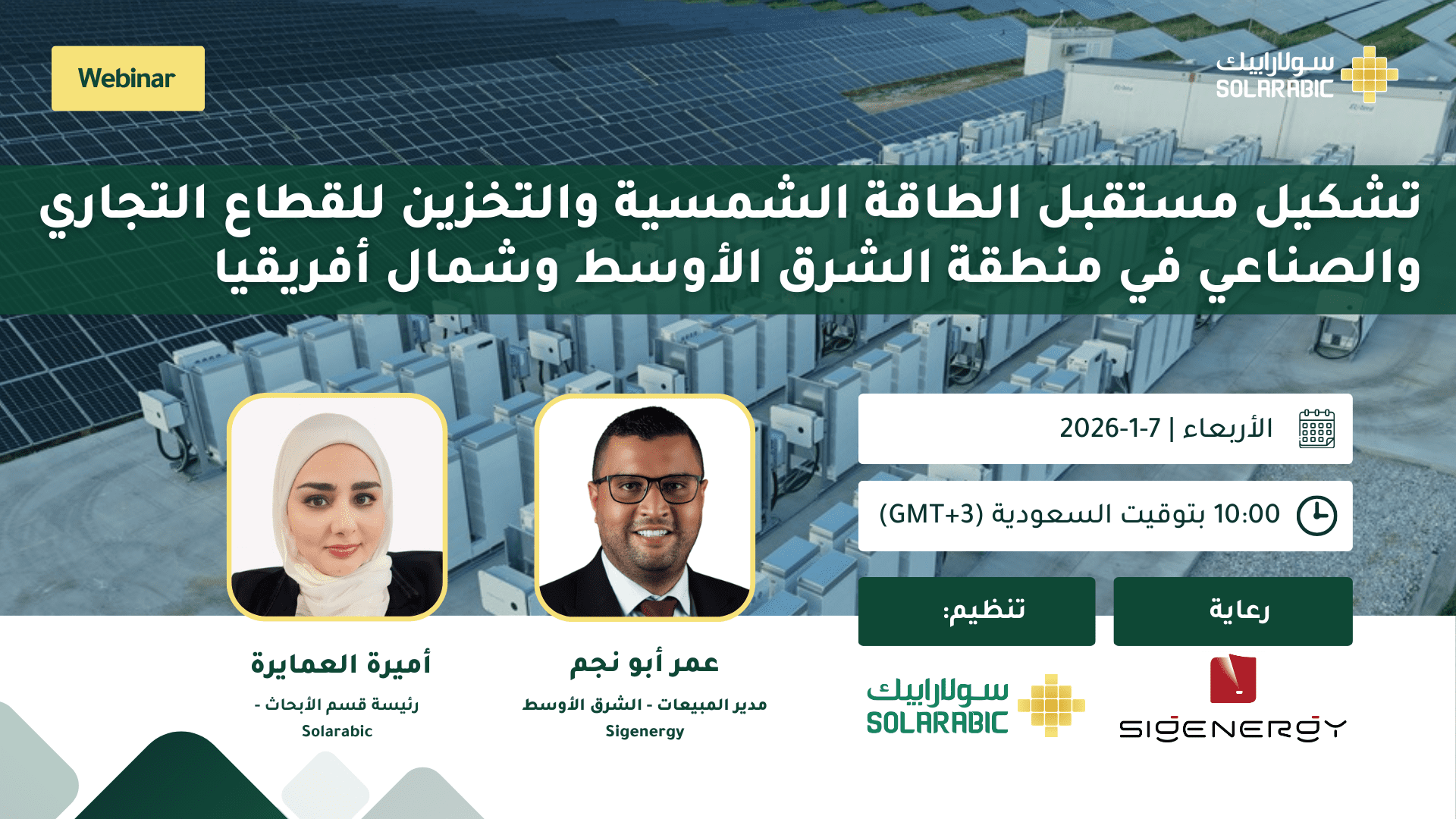 انضموا إلينا في ندوتنا القادمة بعنوان “تشكيل مستقبل الطاقة الشمسية والتخزين للقطاع التجاري والصناعي في منطقة الشرق الأوسط وشمال أفريقيا”، برعاية Sigenergy، حيث نسلّط الضوء على الاتجاهات العالمية والإقليمية التي تعيد تشكيل سوق الطاقة الشمسية وأنظمة التخزين لقطاعي الأعمال والصناعة.